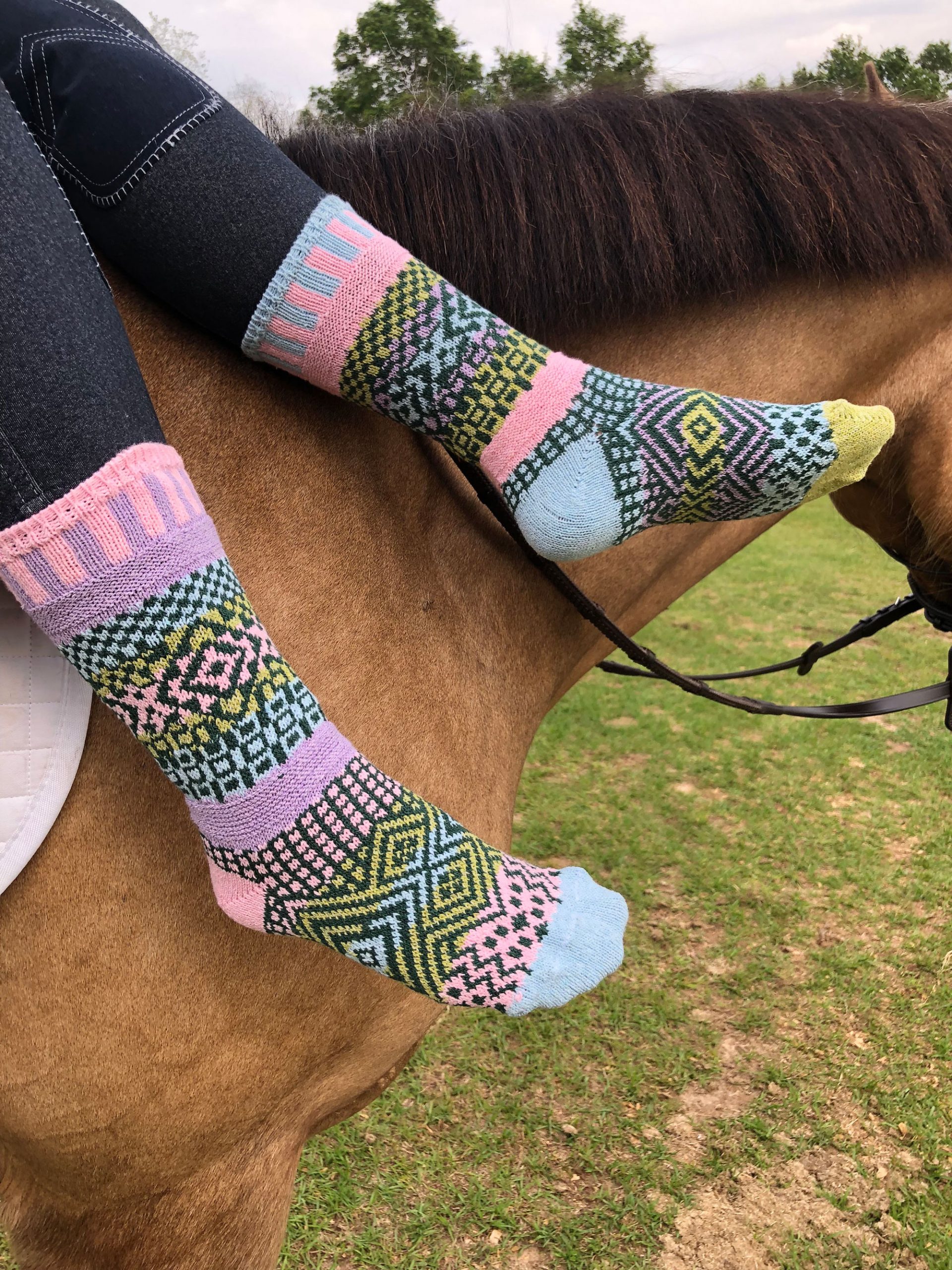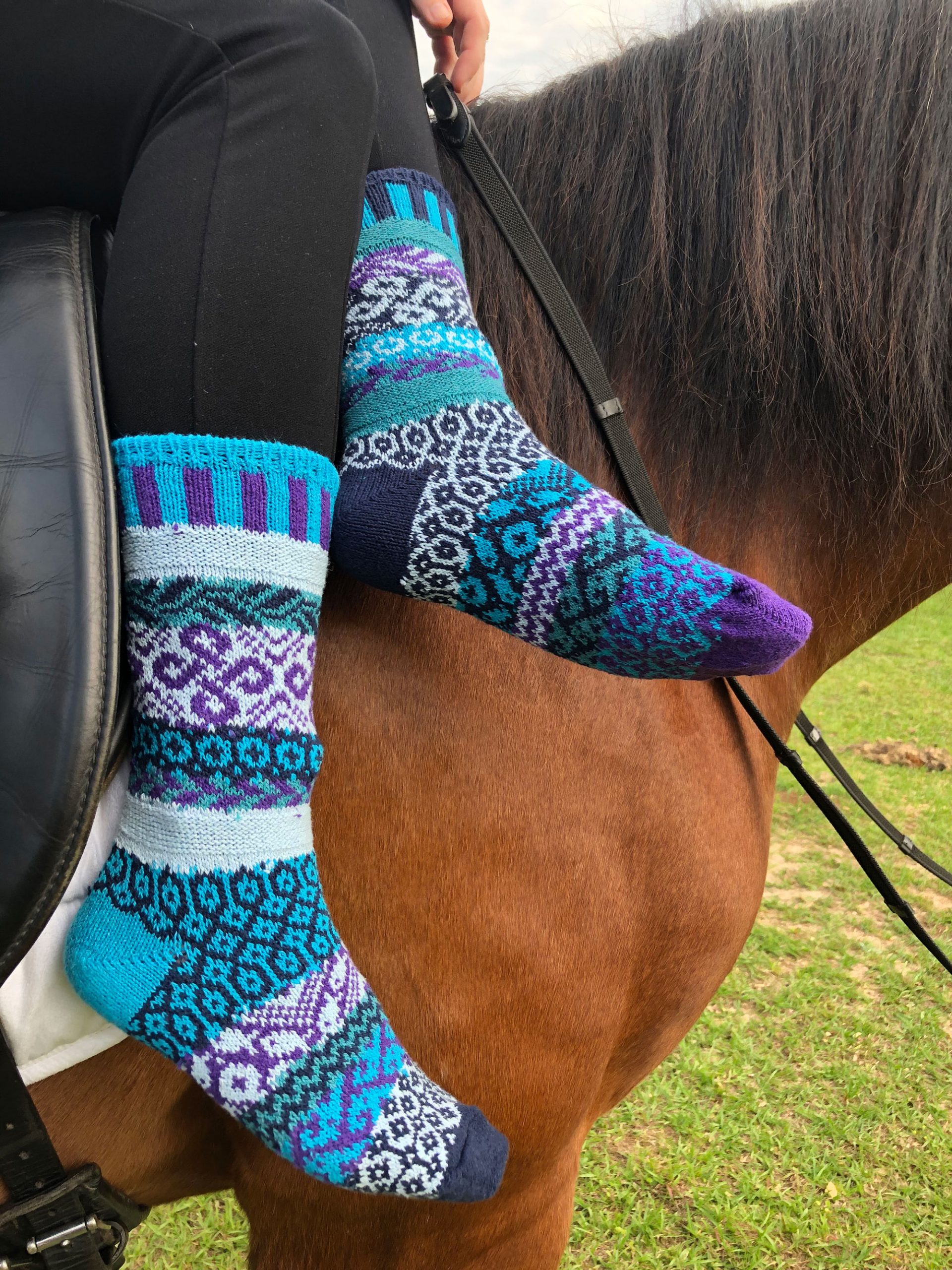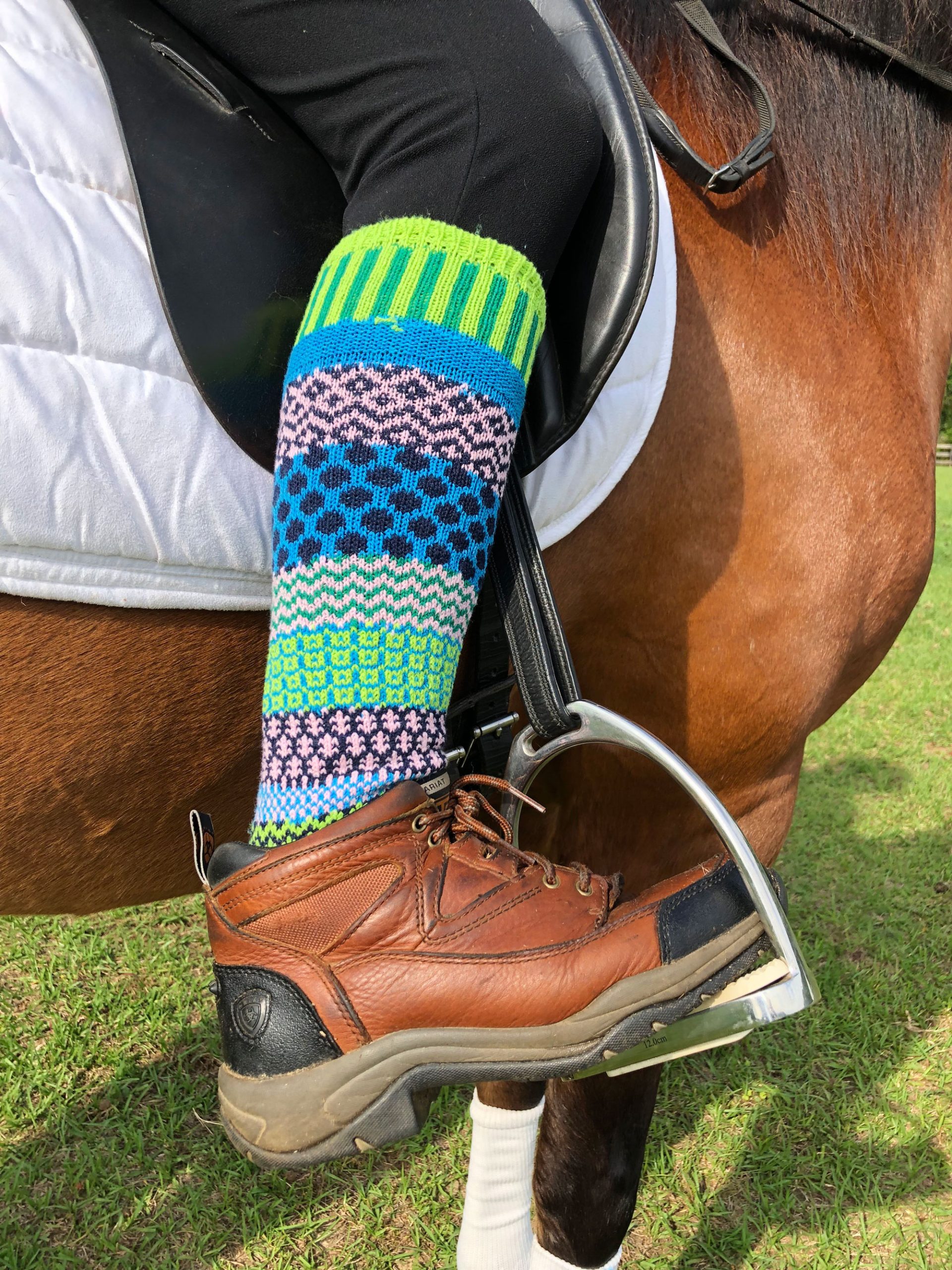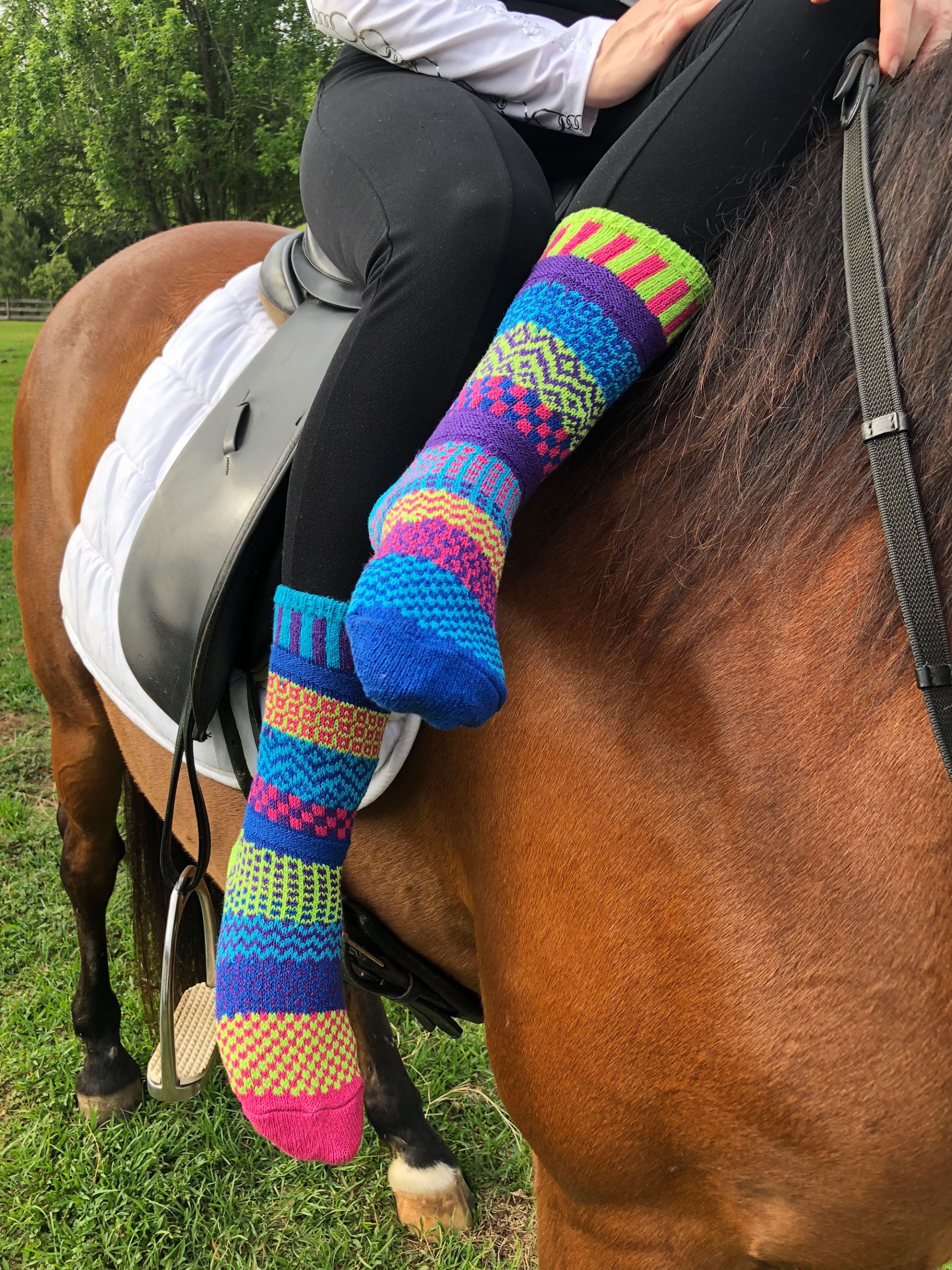 Our second line of socks for your feet are crazy fun! These socks are soft and comfortable to the feet while offering every color in the rainbow from the creative knitting minds that make this delightful line of socks. They bring a chuckle and certainly notice to your everyday boot wear. Show them off! More designs, more sizes of crew and knees coming.