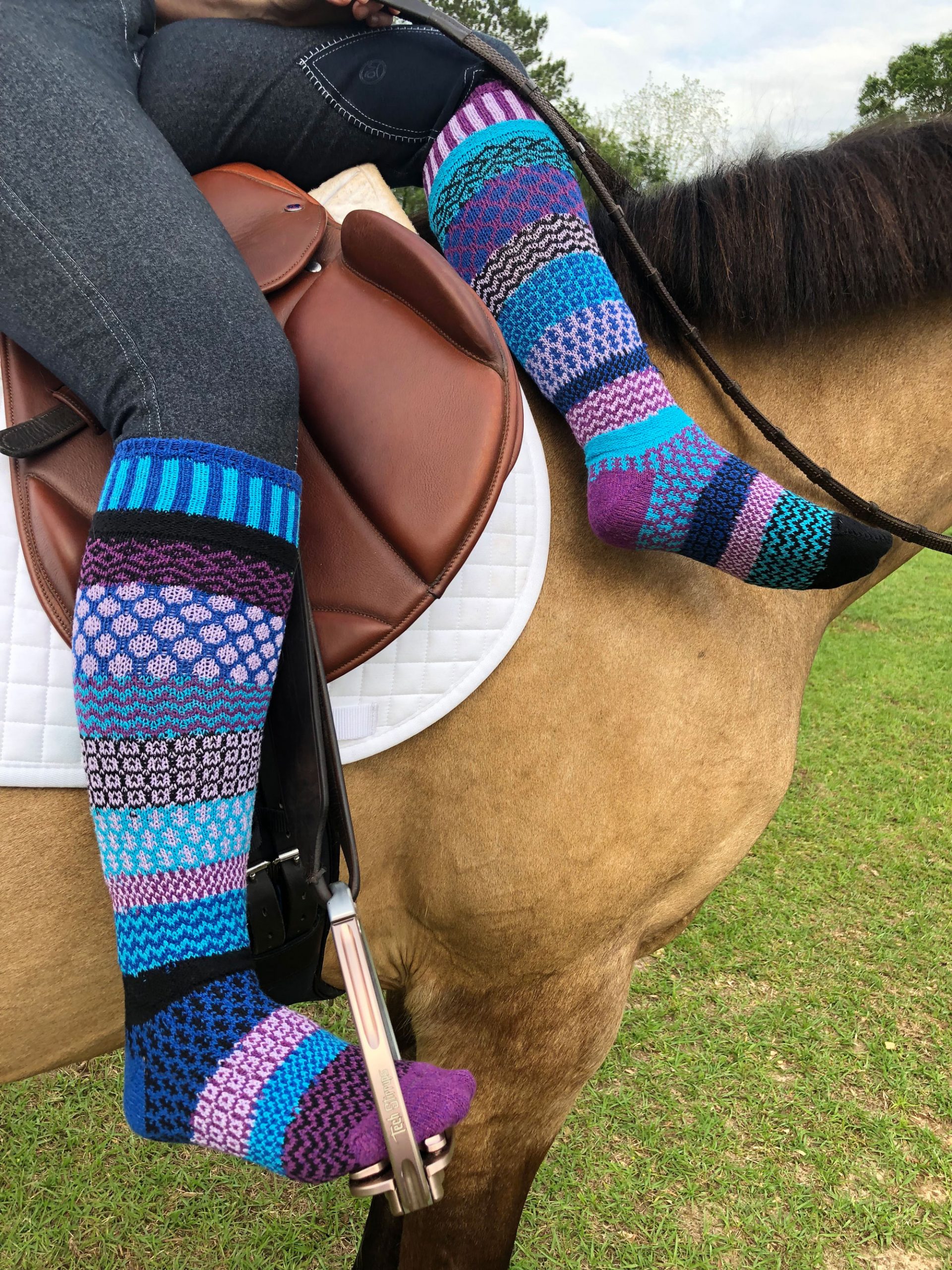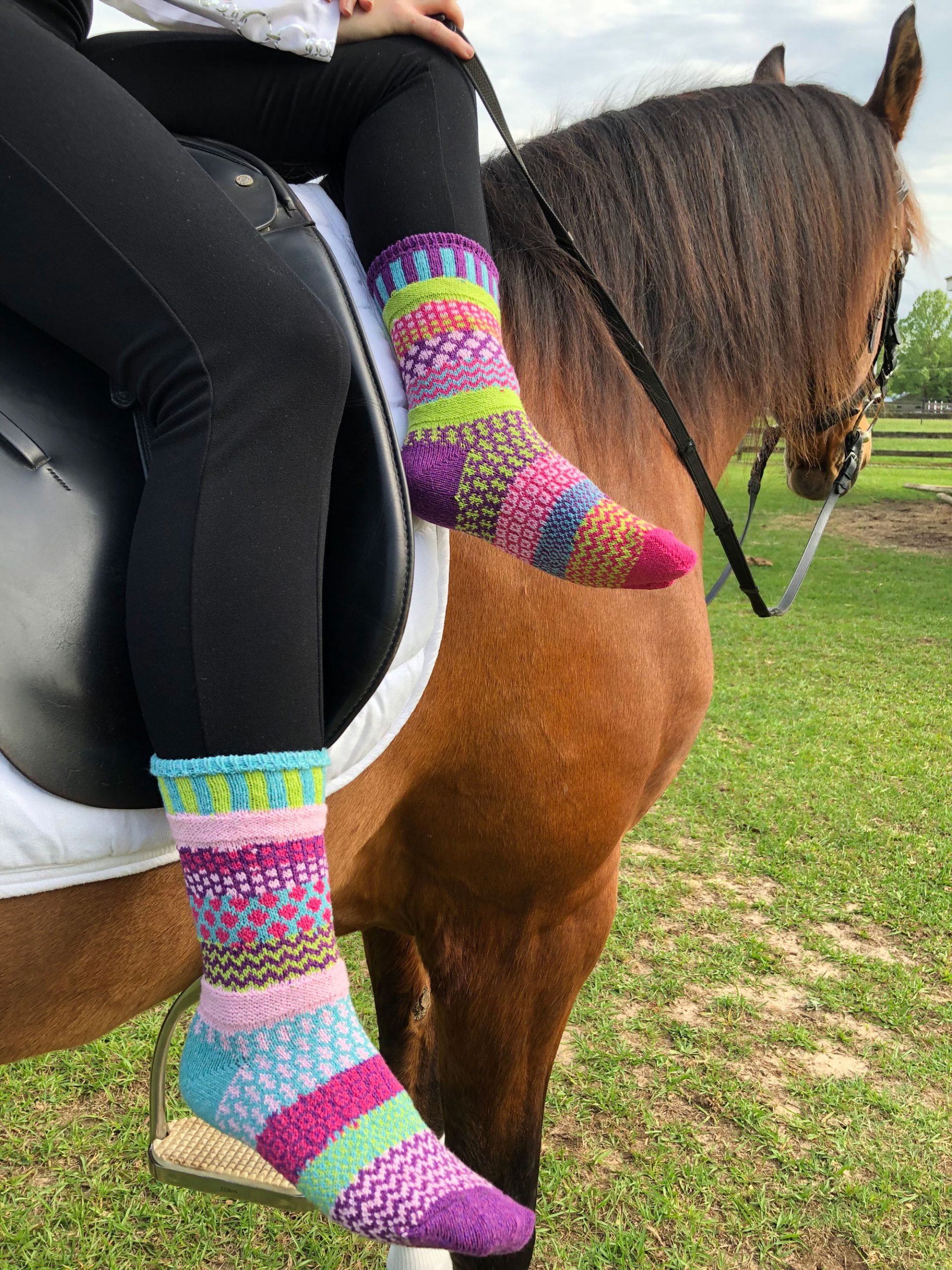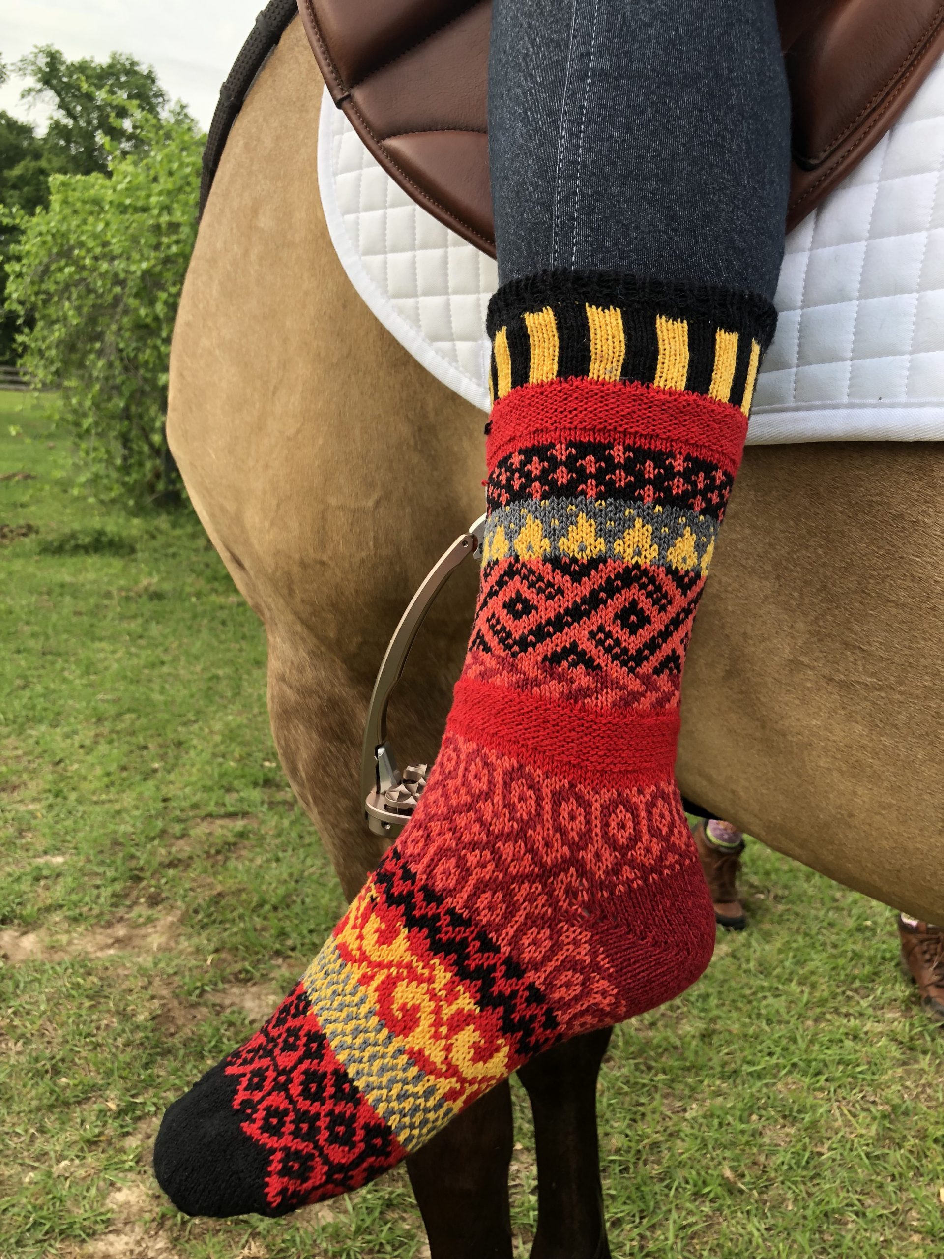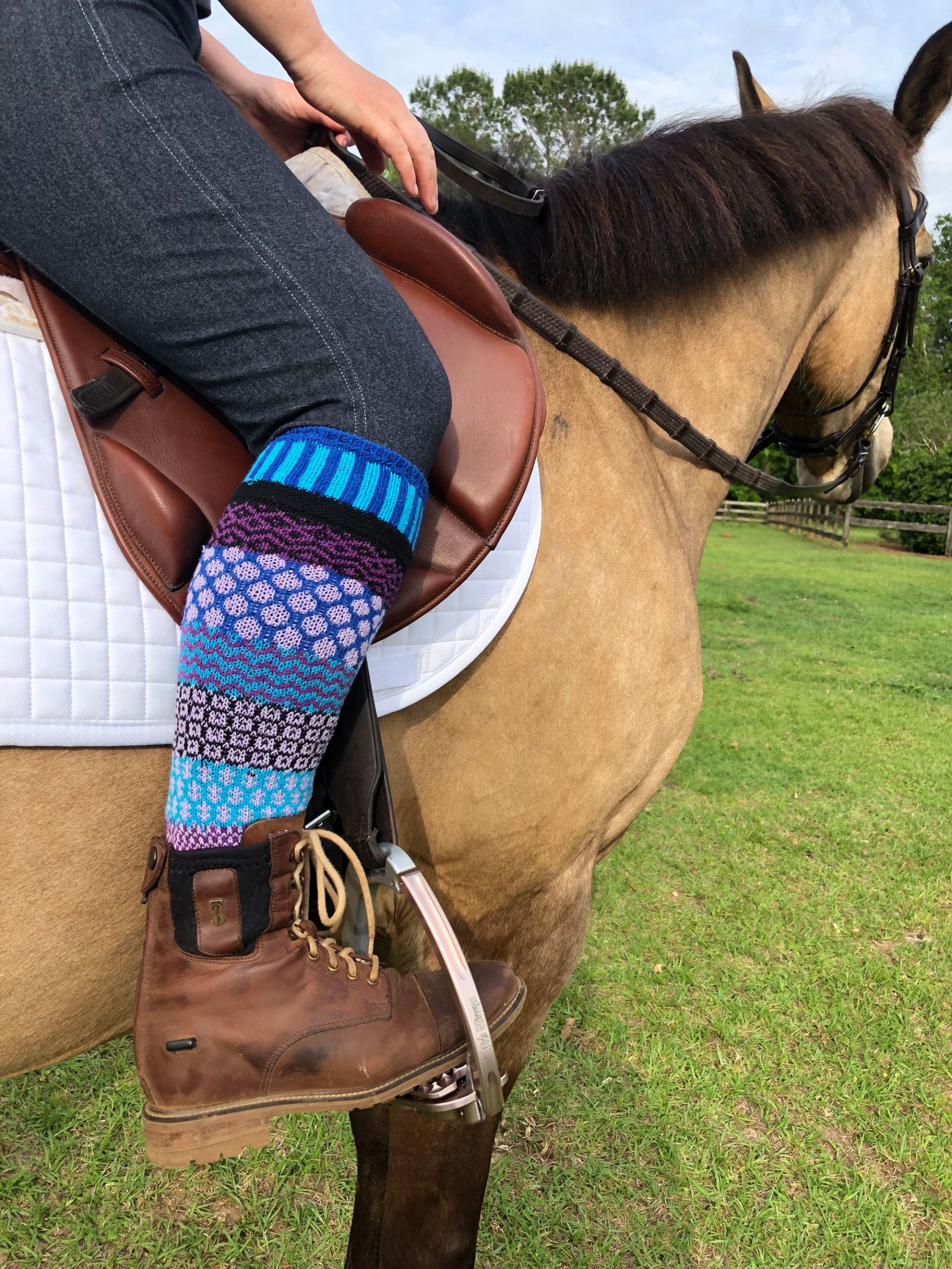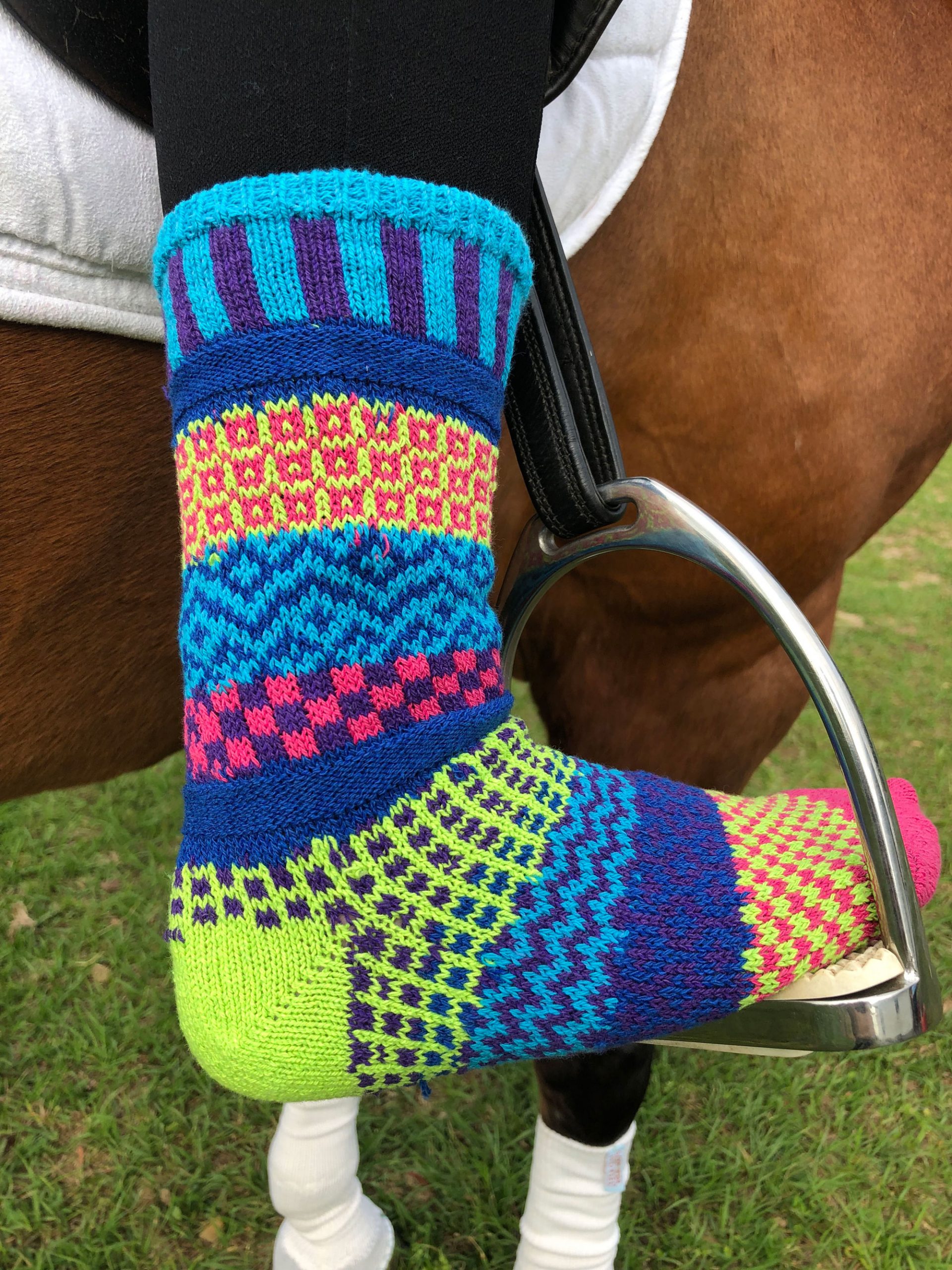 Our second line of socks for your feet are crazy fun! These socks are soft and comfortable to the feet while offering every color in the rainbow from the creative knitting minds that make this delightful line of socks. They bring a chuckle and certainly notice to your everyday boot wear. Show them off! More designs, more sizes of crew and knees coming.
