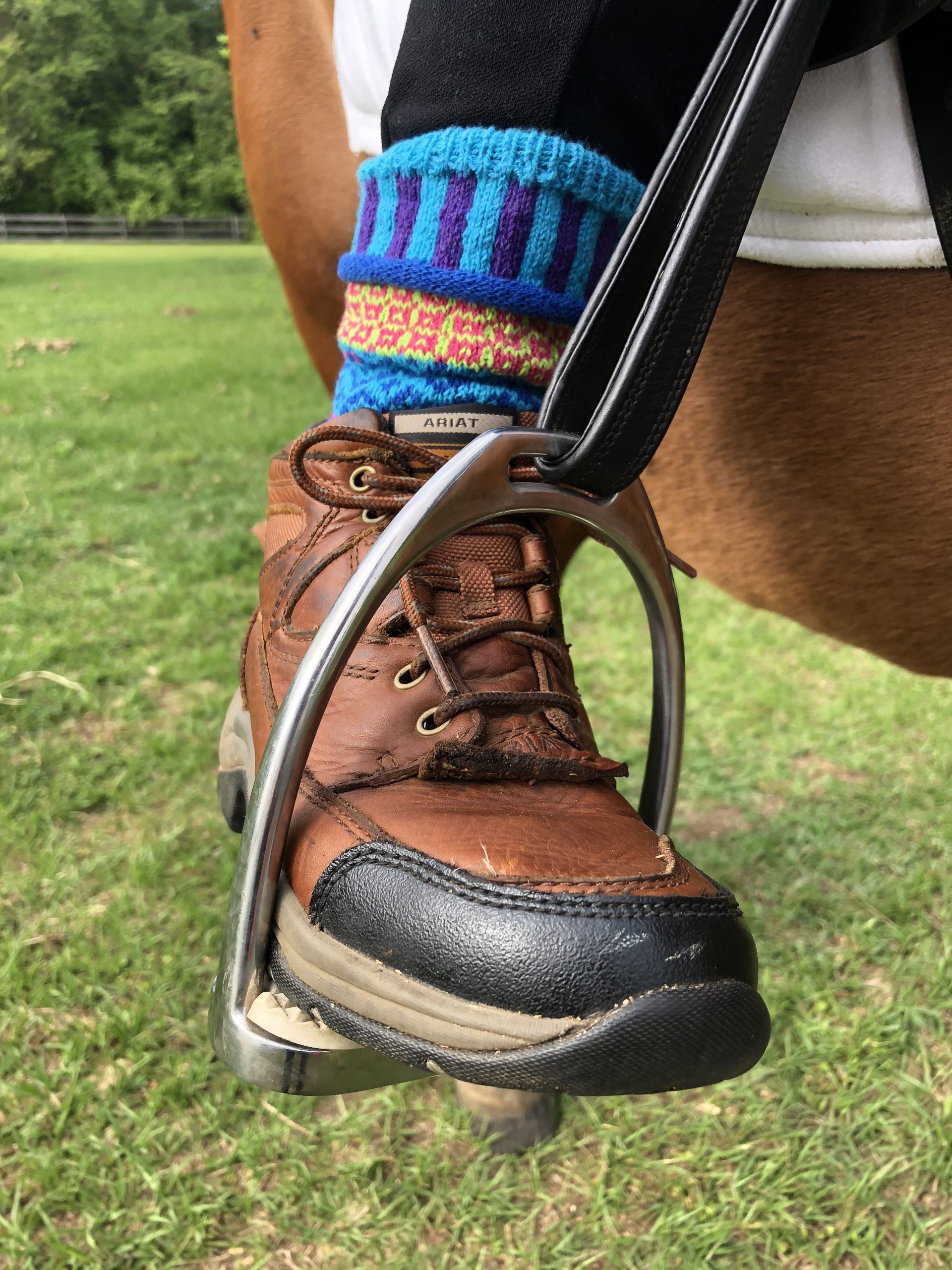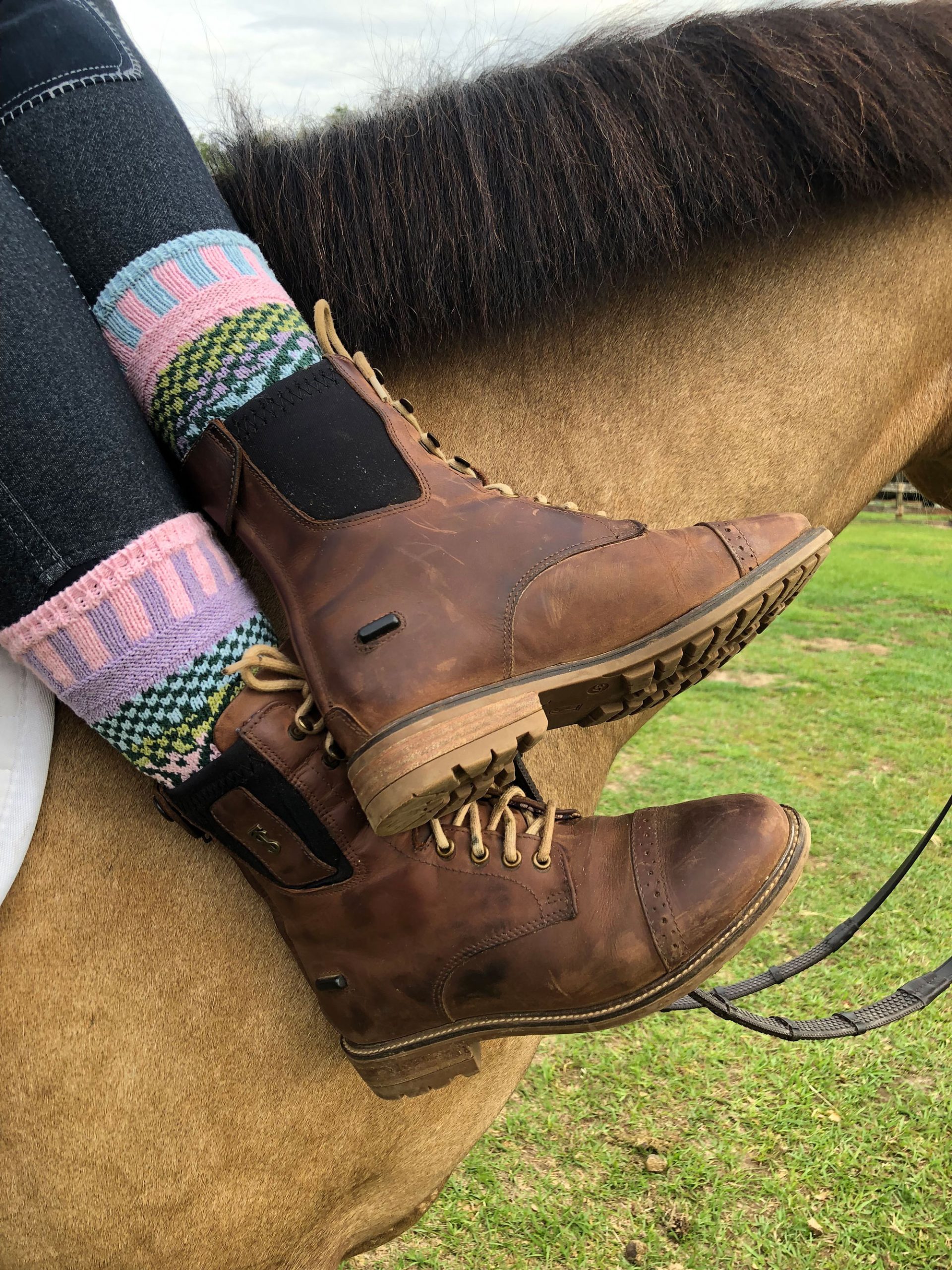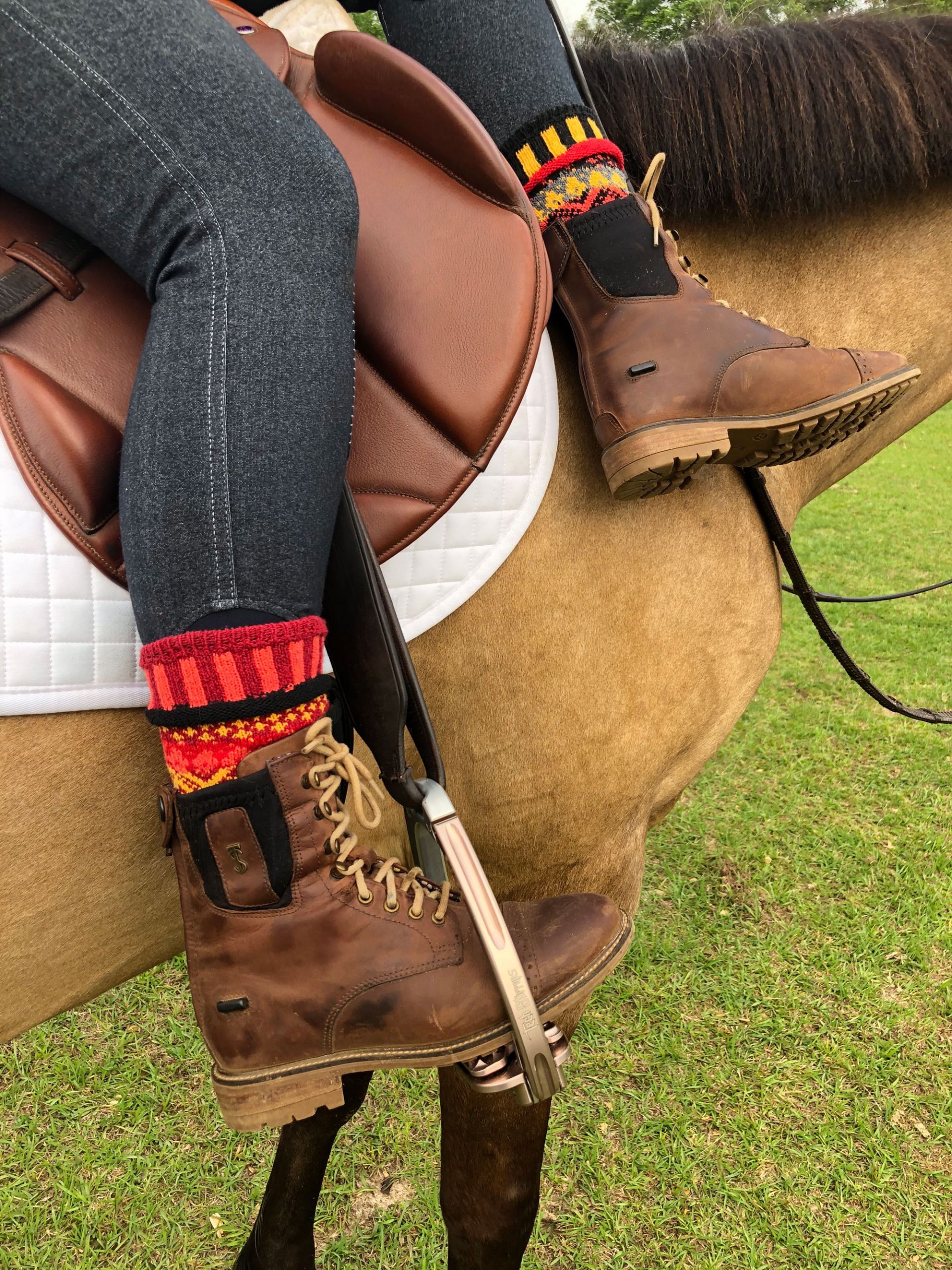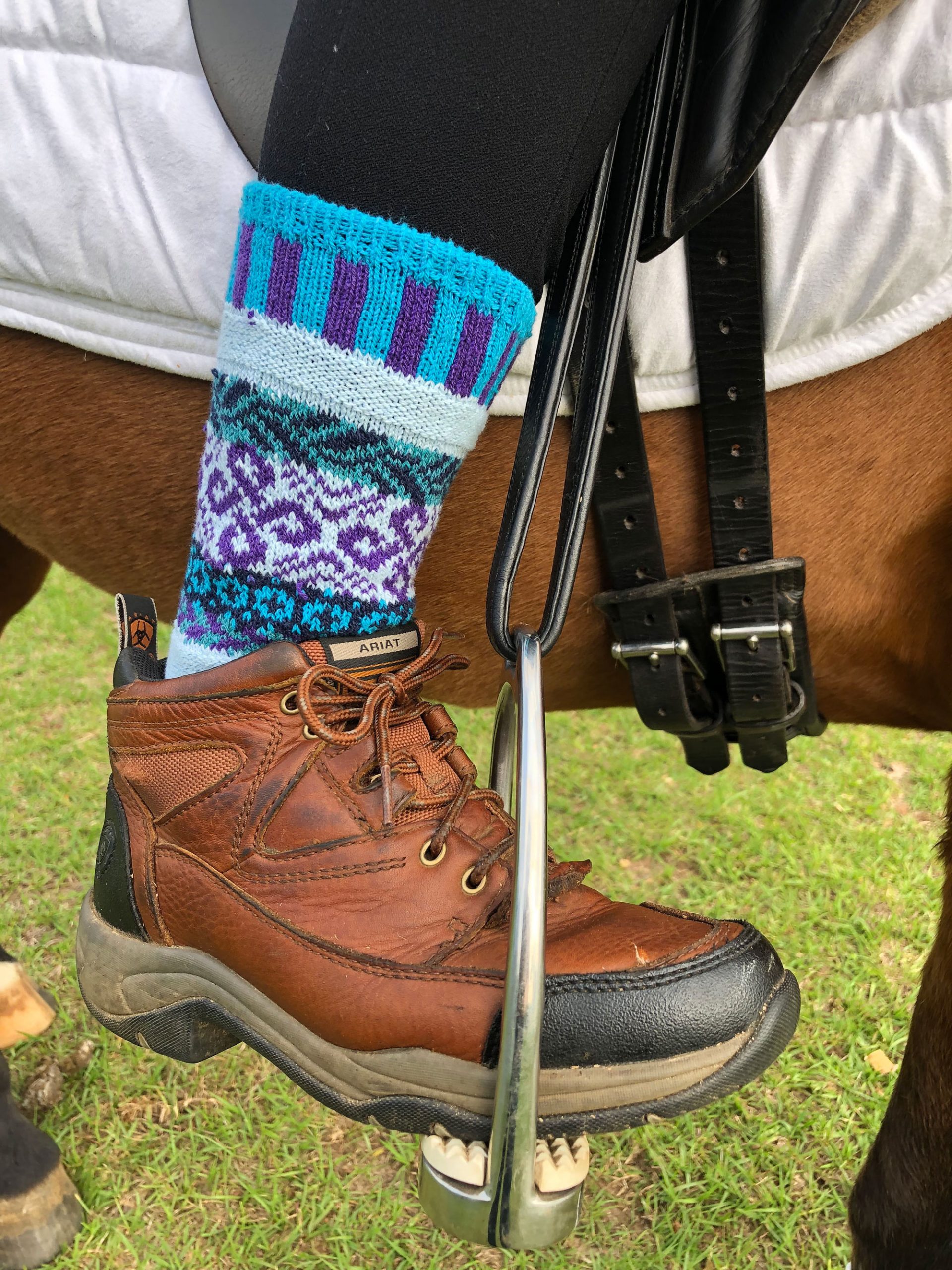Our second line of socks for your feet are crazy fun! These socks are soft and comfortable to the feet while offering every color in the rainbow from the creative knitting minds that make this delightful line of socks. They bring a chuckle and certainly notice to your everyday boot wear. Show them off! More designs, more sizes of crew and knees coming.